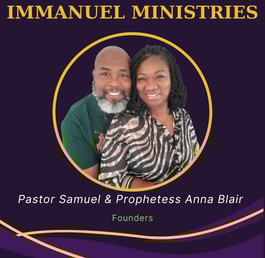Founded by Pastor Samuel Blair and Prophetess Anna Blair, Immanuel Ministries is dedicated to spreading love, hope, and faith to people from all walks of life. Through our various initiatives and programs, we strive to create a transformative spiritual experience that empowers individuals to embrace their purpose and live a life filled with God's grace.